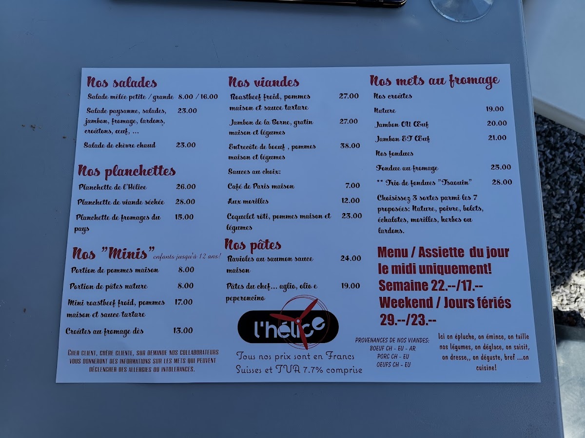 L’Helice, nestled on Rte des Placettes 24 in Bex, Switzerland, offers a unique dining experience that combines culinary delights with breathtaking views. Patrons rave about the standout fondue, perfectly paired with an ambiance that enhances its charm. Whether you're enjoying a meal during an exhilarating air show or savoring the leisurely pace, the attentive service here is consistently praised. With fair prices and a scenic backdrop that allows for aircraft spotting, L’Helice successfully marries delicious food with a memorable atmosphere, making it a must-visit destination for food lovers and aviation enthusiasts alike.